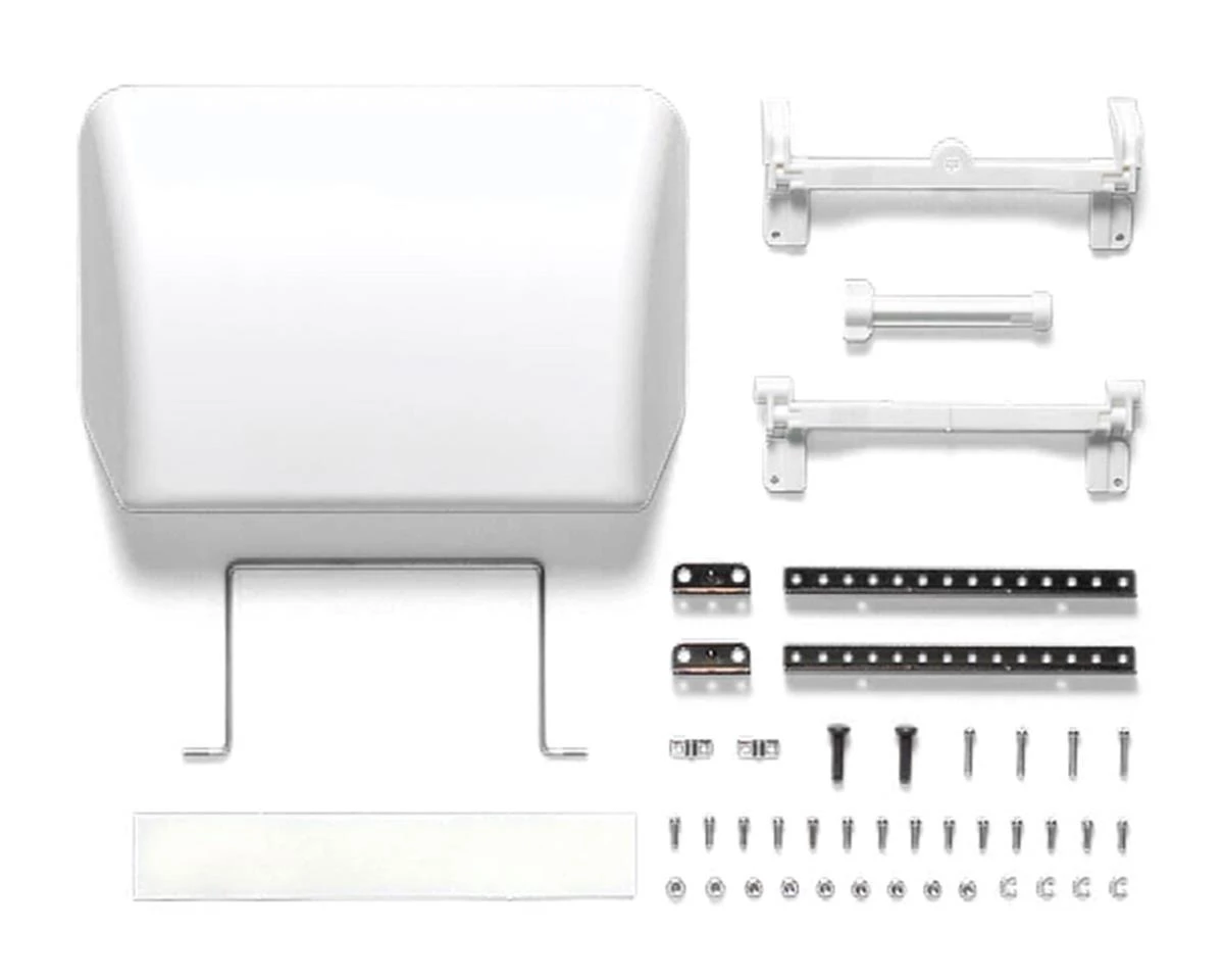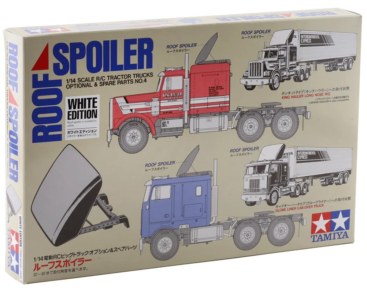 The Tamiya 1/14 Semi Roof Spoiler is an adjustable wind-deflector type roof spoiler designed for Tamiya’s 1/14 scale radio controlled Tractor Trucks. The realistic Roof Spoiler not only enhances appearance but is also functional as seen on full-sized trucks. The Roof Spoiler can be mounted easily using double-sided tape or screws included in the set. Vital components such as spoiler-rails and spoiler-rod use metal parts to attain necessary strength while the deflector panel and cross-member is injection molded for scale appearance. Spoiler angle can be easily adjusted between 30 – 90 degrees allowing you to select the desired angle.