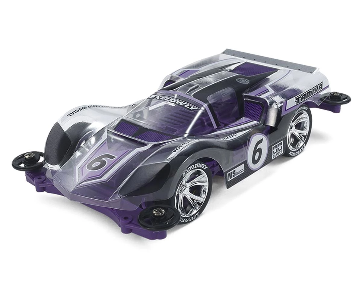 The Tamiya 1/32 JR PRO Racing Exflowly Purple Special Mini 4WD Kit is a special edition release of the classic Exflowly (original kit: TAM18612). This updated version features a speed-oriented clear polycarbonate body paired with the easy to assemble MS chassis in a purple-themed color scheme.