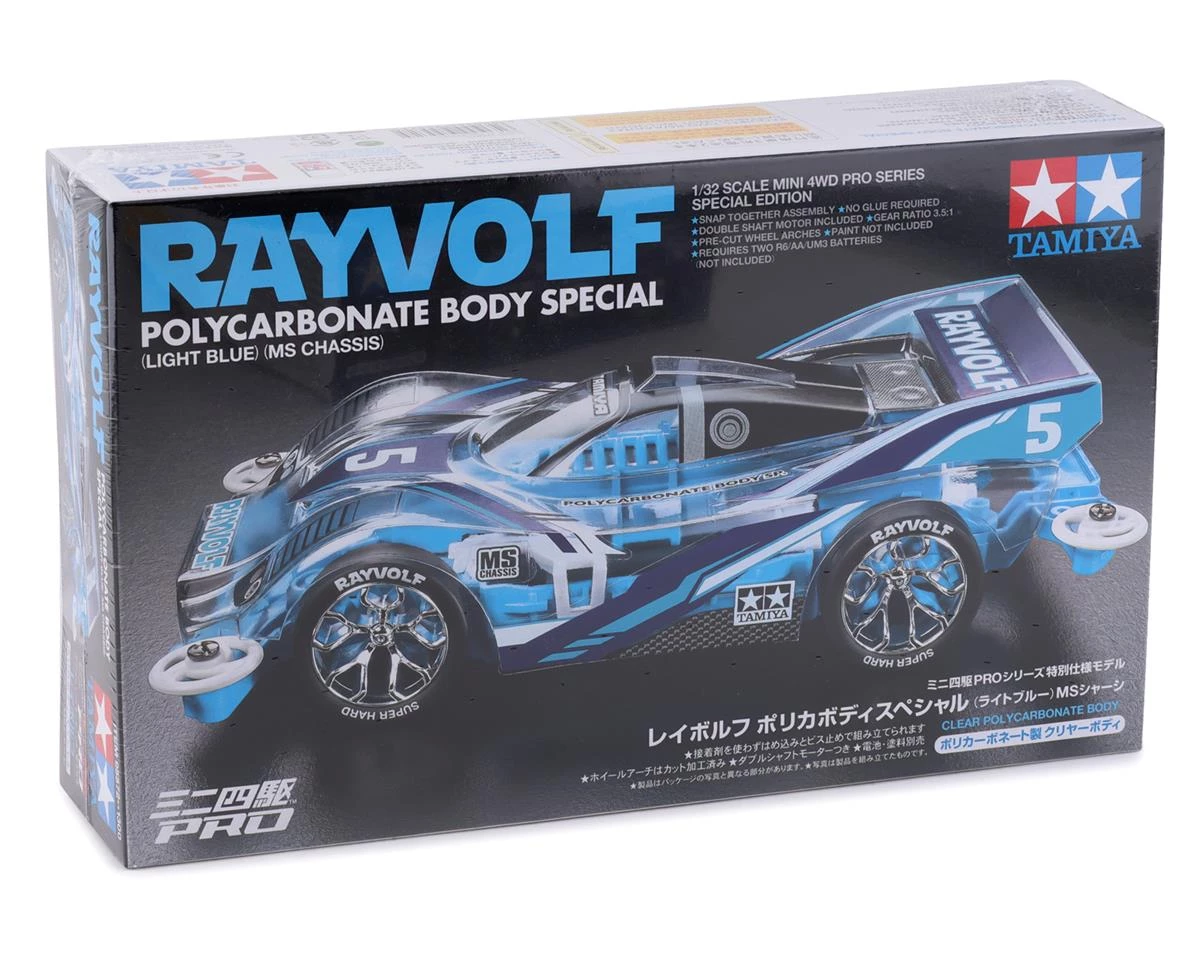 The Tamiya 1/32 PRO JR Racing Mini 4WD Rayvolf LT Blue Special Kit is a special edition release of the classic Rayvolf (original kit: TAM18611). This kit features a speed-oriented clear polycarbonate body paired with the easy to assemble MS chassis in a light blue-themed color scheme.