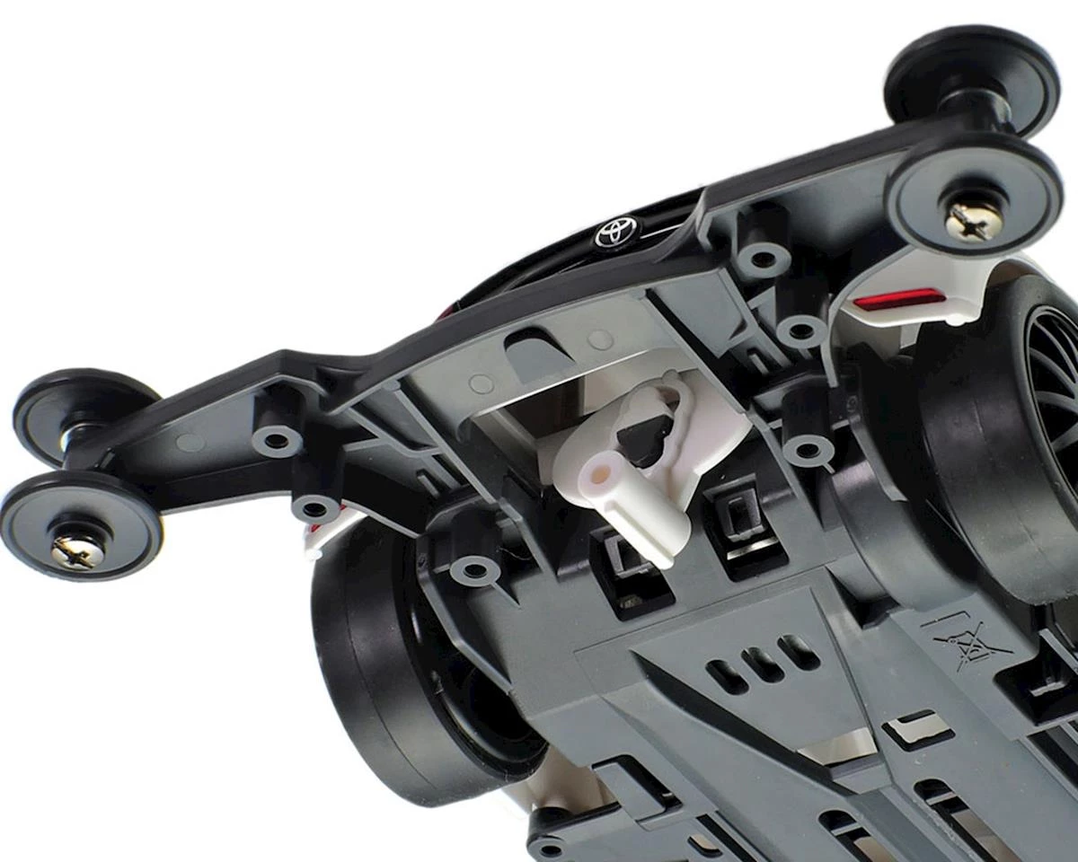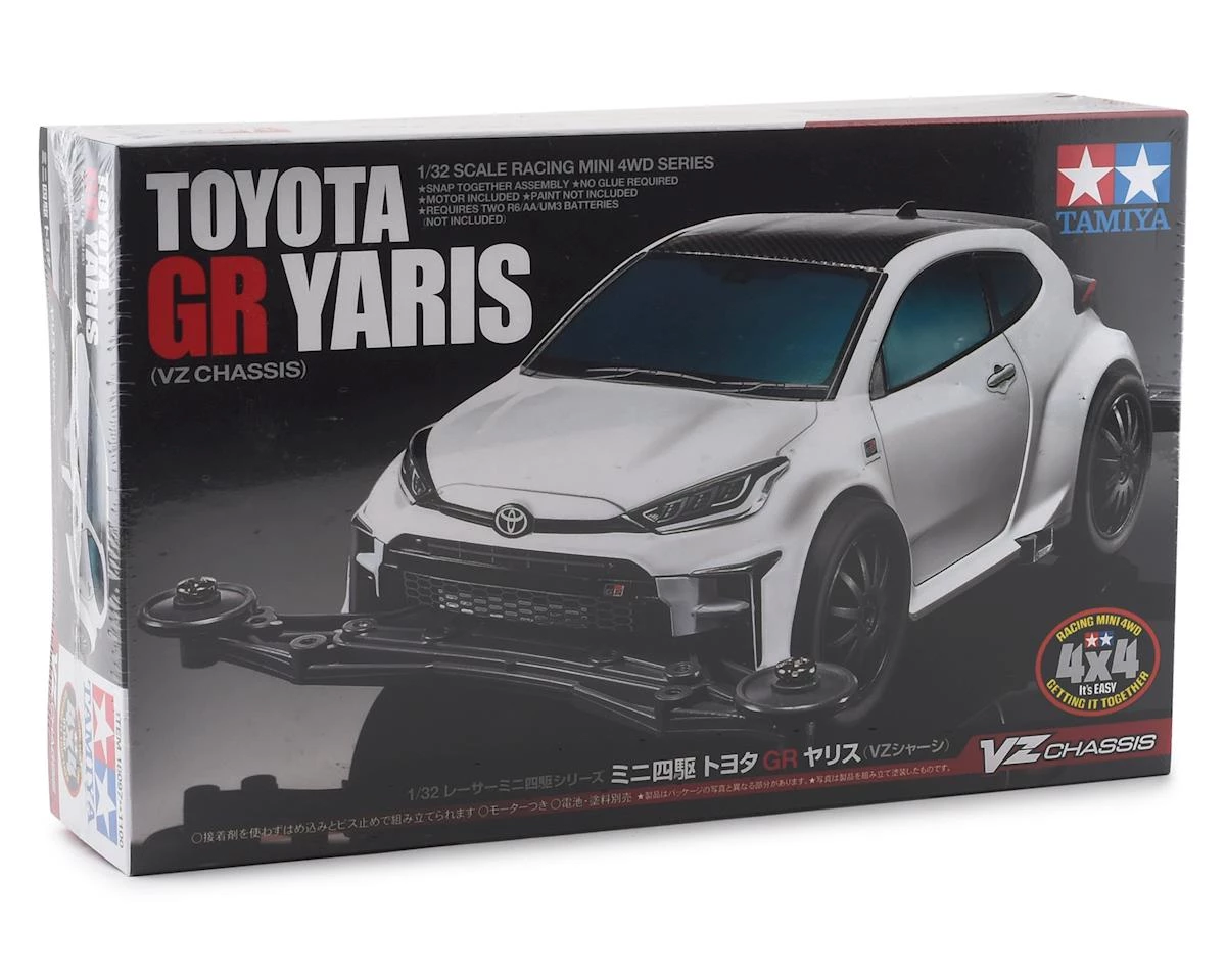 This is a Tamiya 1/32 JR Toyota GR Yaris Mini 4WD Kit. The GR Yaris has a 272hp 1.6-liter 3-cylinder engine, GR-FOUR sports 4WD system and 6-speed manual transmission – no ordinary hatchback. This Mini 4WD kit recreates the popular hatch-back on the compact and quick VZ chassis.
