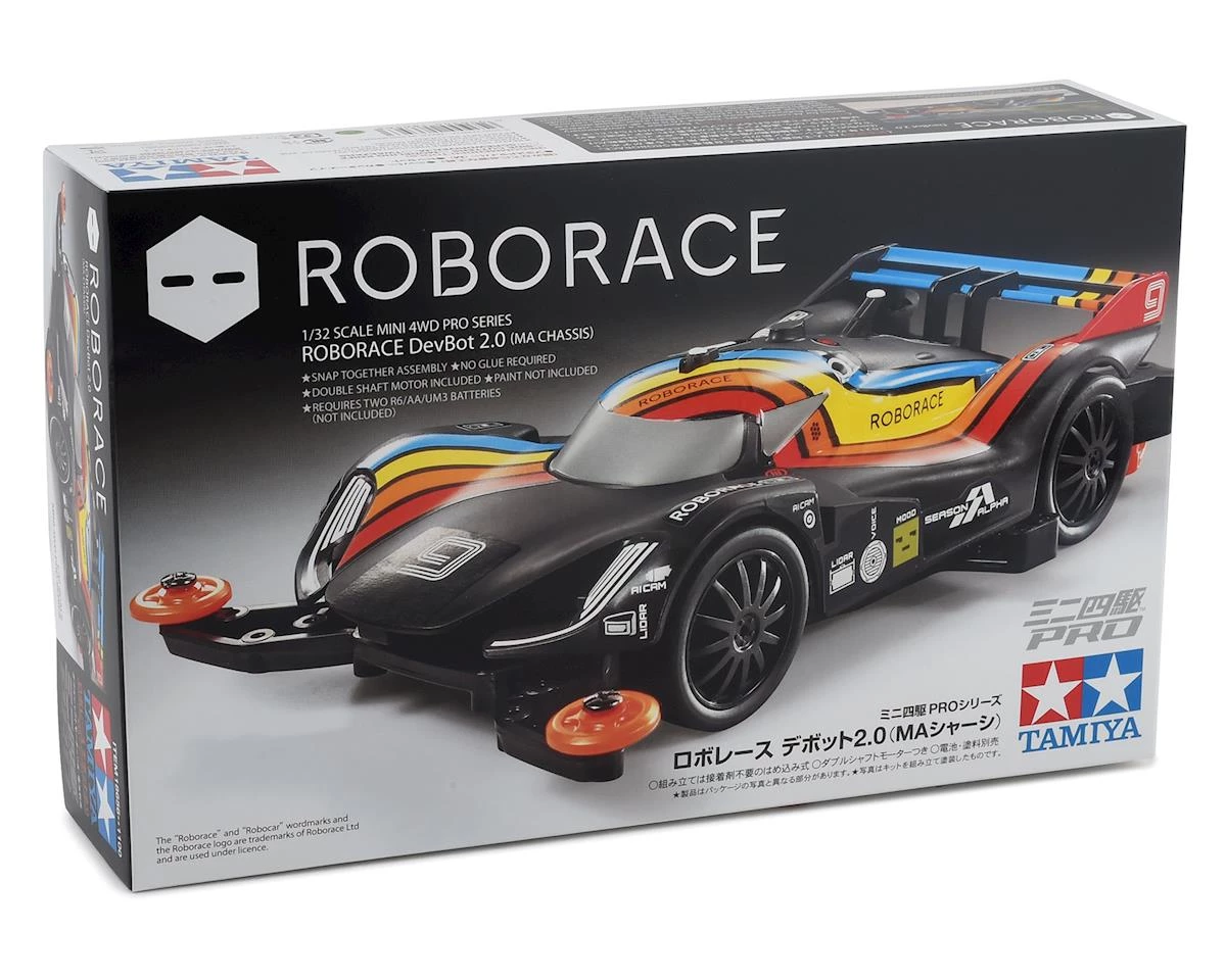 Tamiya 1/32 Roborace DebBot 2.0 MA Chassis Mini 4WD Kit. Roborace is an exciting development in the world of motorsports, testing the limits of autonomous driving in electrically powered vehicles. This Mini 4WD racer kit replicates the exciting DevBot 2.0 as seen from the creators of Roborace. The DevBot 2.0 racecar runs on the Nvidia DRIVE platform, which is designed to aid the development process for cars in the Roborace series. The hardware is managed centrally and is the same for each team, meaning that the only differentiator is the AI driver software the teams develop for the competition. Furthermore, it can be driven by a human or AI driver, meaning engineers can explore the relationship between man and machine for assisted and autonomous technologies. This exciting and cutting-edge race car appears on the Mini 4WD PRO model platform, which is based upon the aerodynamically efficient MA Chassis!
