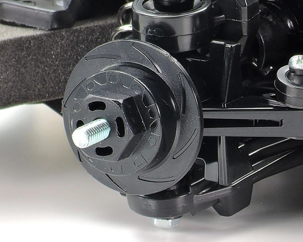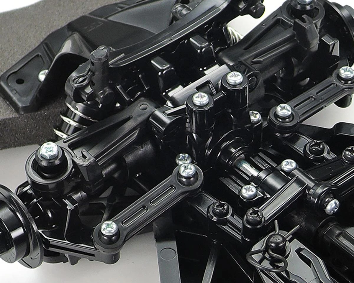 The shaft-driven 4WD TT-02 chassis employs a longitudinal layout with the battery on the left and the motor on the right, to give excellent stability. In addition, it features identical left and right suspension arms and uprights for ease of assembly, plus easy-to-maintain gearboxes. It is a highly adaptable chassis, as it offers 2 different wheelbases, 2 ground clearance settings and 2 tread set-ups in addition to a range of 10 possible gear ratios. It is not short on looks either, with brake disc-shaped wheel hubs and stylish front bumper supports.