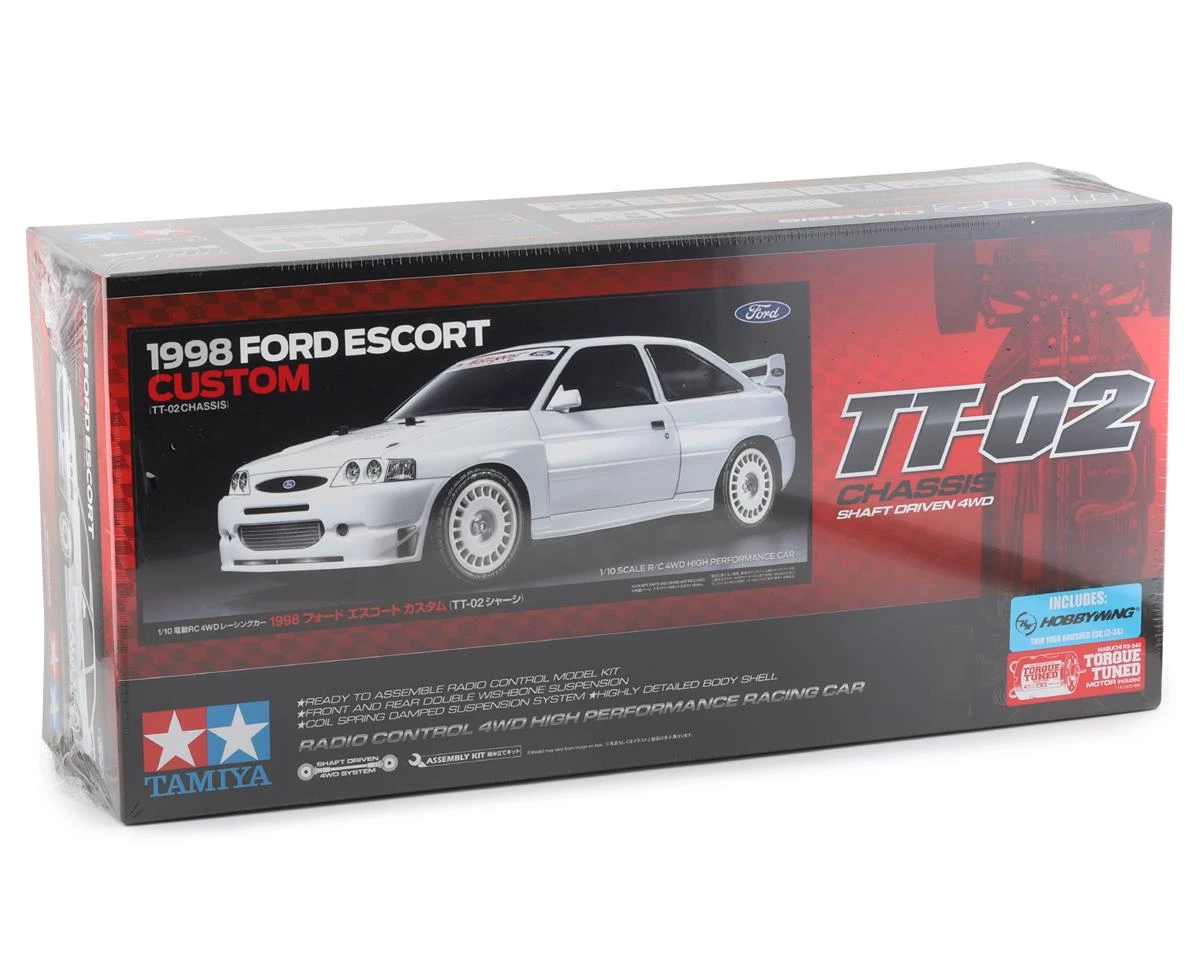 The Tamiya 1998 Ford Escort Custom 1/10 4WD Electric Touring Car Kit is modeled after the Ford Escort in a customized street version of the WRC car, and sits upon the TT-02 chassis. The full size car was powered by an Inline-4 2.0L engine offering 295HP and 361lbft of torque.