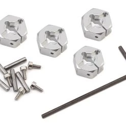 Tamiya Aluminum 6mm Clamp Type Wheel Hub Set. These optional machined aluminum hubs clamp to the wheel axle rather than the slip-on stock plastic units, resulting in a truer spinning wheel and added strength. Set includes four hubs and installation hardware.