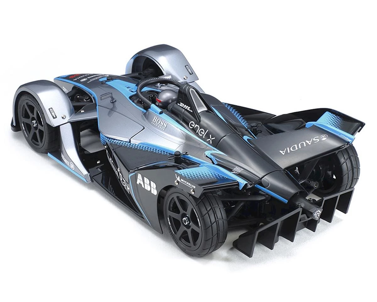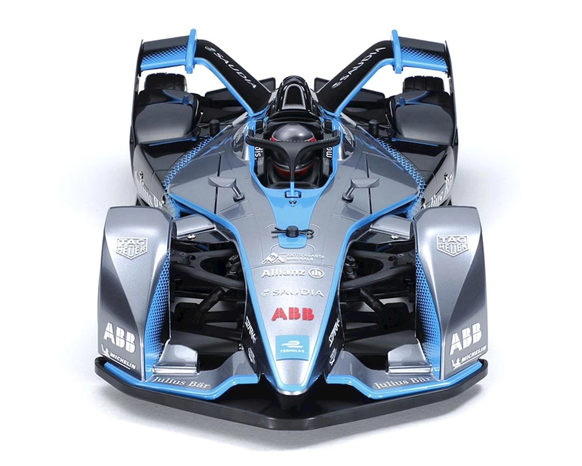 The Tamiya TC-01 Formula E Gen2 Car Championship Livery Chassis Kit celebrates the GEN2 car seen in the 2018 Formula E championship. The sleek, high-tech body with arch covered wheels is recreated in polycarbonate. Halo, mirrors and rear diffuser/bumper are molded ABS components. Markings are included to recreate the Championship Livery car, and the model is based upon the shaft-driven 4WD TC-01 chassis.