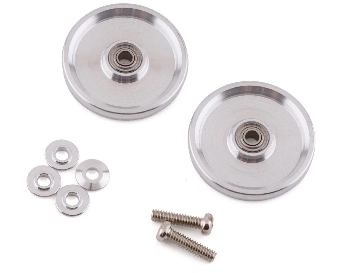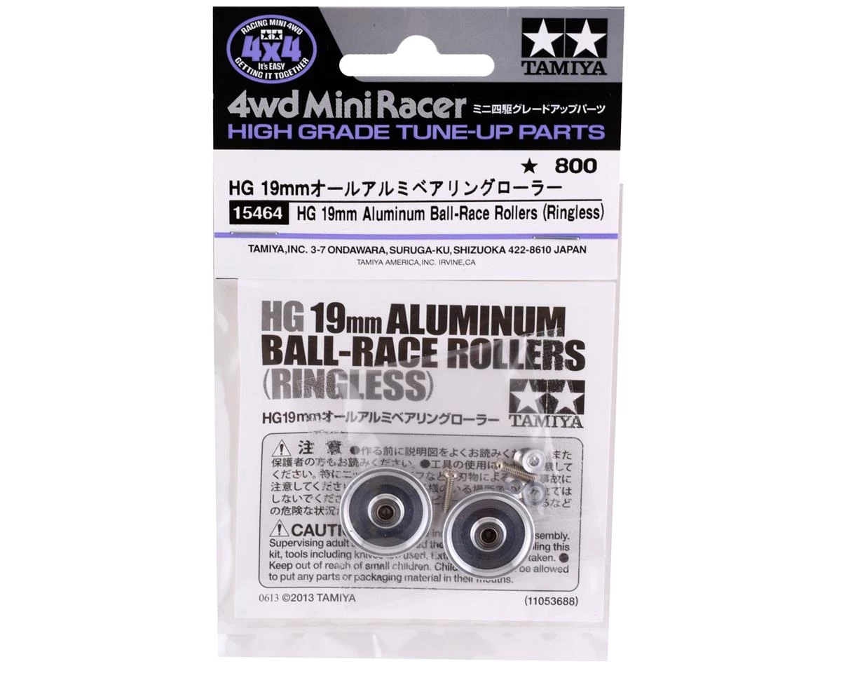 Tamiya HG Aluminum Ball-Race Rollers. These optional rollers come with 520 bearings preinstalled to allow a super smooth movement. A smooth flat edge is used rather than an O-ring for less friction. The lower friction can allow for increased speed through corners. These rollers may be used in either the front or rear location. Package includes two rollers two spacers and two screws intended for all Tamiya Mini 4WD and Mini 4WD Pro chassis.