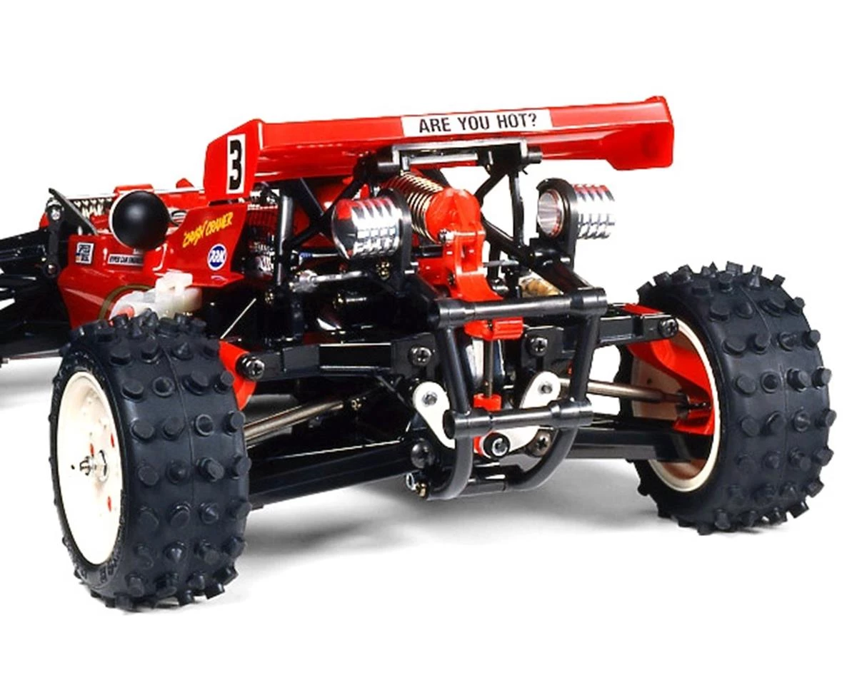 This Tamiya Hotshot is a re-issued R/C assembly kit of the original Hot Shot. It originally debuted in 1985 as Tamiya’s first 4WD off-road buggy. The buggy features a shaft drive 4WD system providing stable performance while running and cornering. Drive and propeller shafts feature dog bone type linkage, while front and rear differential gears provide smooth handling. Furthermore, the front and rear dampening is handled by a single mono-shock for both the front and rear suspension in addition to using sway bars to hold corning performance.