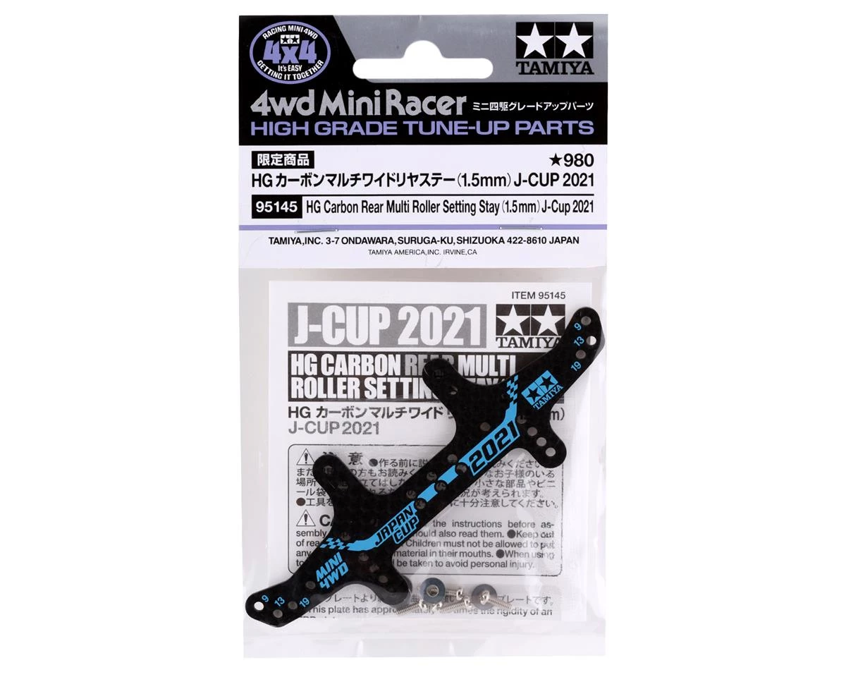 The Tamiya JR 1.5mm Carbon HG Multi-Roller Setting Stay, is a limited edition front stay that commemorates the Tamiya 2021 Mini 4WD Japan Cup. Machined out of carbon fiber, this stay is the same shape as the TAM95122, however, this features the Japan Cup and Tamiya Logo. Package includes one front stay with mounting hardware.