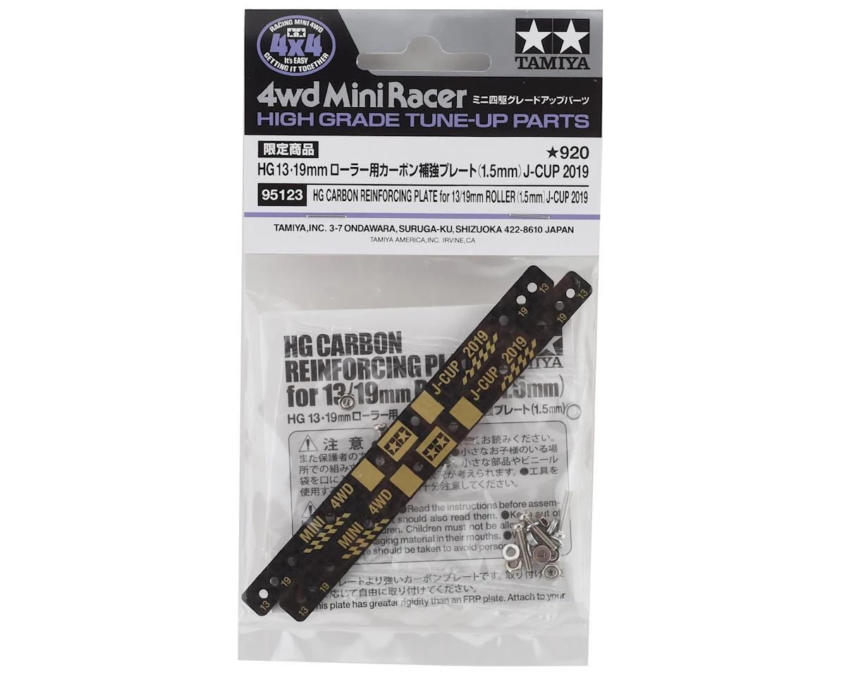 These reinforcing plates allow attachment of two roller types in wide positions that are just inside the Mini 4WD official regulations. This specific set commemorates Japan Cup 2019.