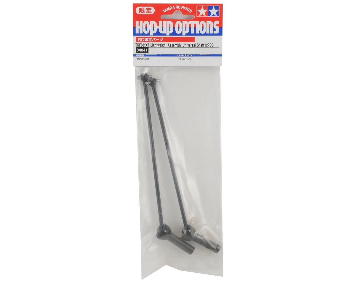 This is a optional Tamiya Lightweight Front/Rear Universal Shaft Set, and is intended for use with the Tamiya TRF801Xt. The lightweight of these Universal Shafts is achieved by reducing the shaft diameter from 4.2mm to 3.4mm. The weight of a single standard shaft is 35g, compared to the lightweight shaft which is 29.5g, which equals a weight saving of 5.5g. Which means when all four shafts are replaced, you can save a total of 22g of rotating mass.