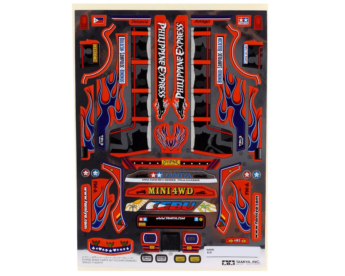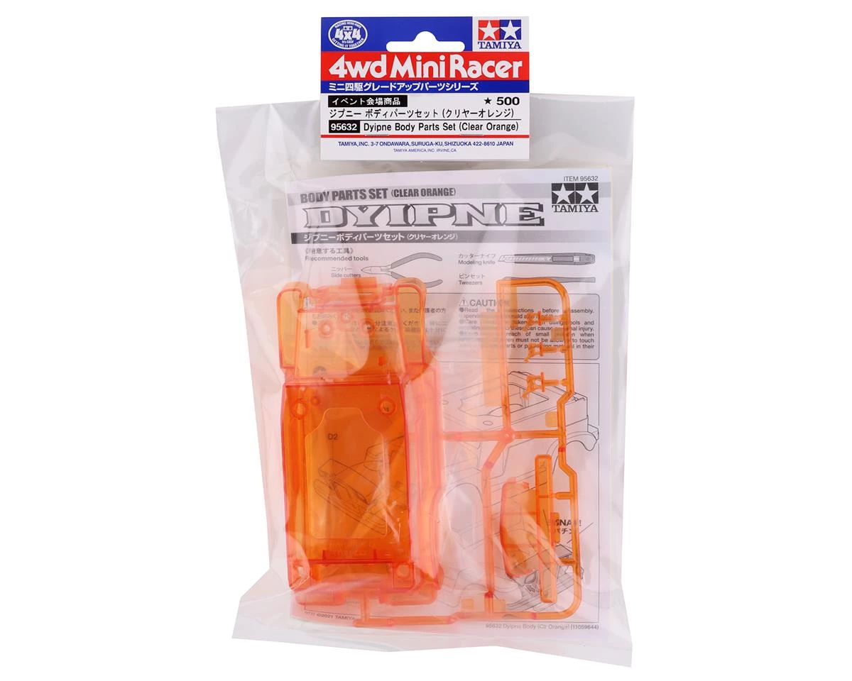 Tamiya Limited JR Dyipne Body Set. This body set is made of clear orange ABS and is intended for the Tamiya Mini 4WD FM-A Chassis. Package includes one body set and one decal sheet.