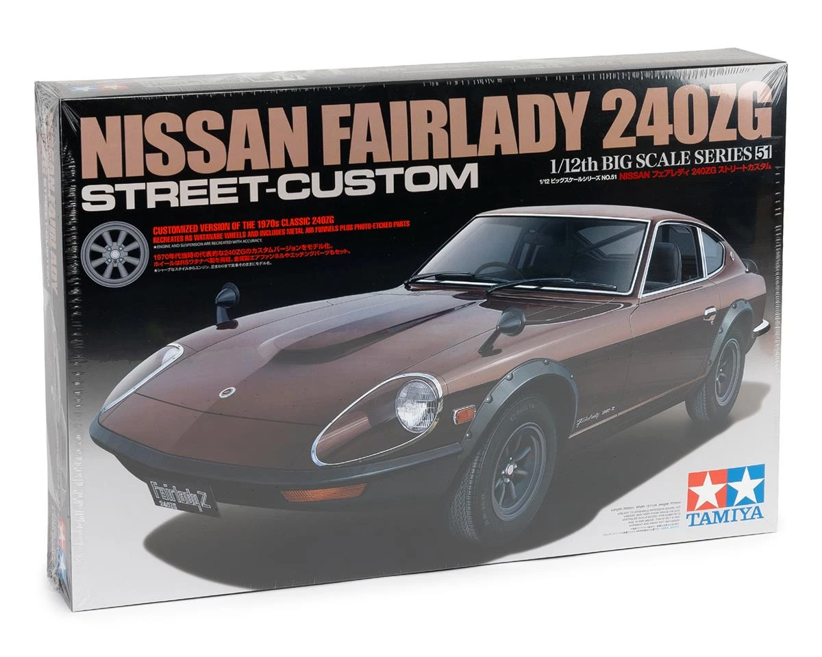 The Tamiya Nissan Fairlady 240ZG Street Custom 1/12 Model Car Kit accurately depicts the full sized model that was released in 1971. This model features a realistic engine bay, interior, roll cage, seats, opening tailgate, functioning suspension, tandem steering wheel and much more. This model sits on four scale RS Watanabe 8-Spoke wheels with rubber tires.Â