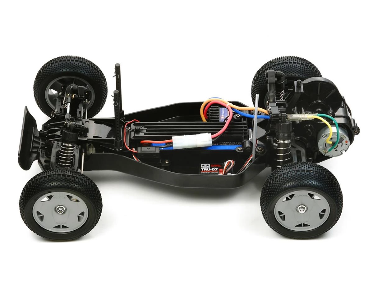 The DT-02 chassis bathtub type frame chassis features a longitudinal battery layout for lower center of gravity and optimum weight distribution. 4-wheel double wishbone suspension is equipped with CVA oil damper units to provide superb off-road traction. A sealed gearbox protects against dust and debris and is equipped with differential gears to ensure smooth cornering. Star-dish wheels are paired with dual block K tires front and rear to ensure that the model offers a dynamic drive.