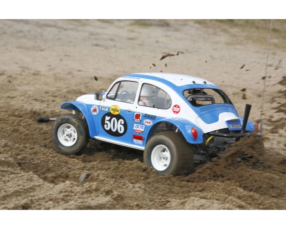 Tamiya Sand Scorcher 2010 Off-Road 2WD Racing Buggy Kit. Just as the original, this rerelease Sand Scorcher features ribbed front tires and paddle rear tires. This model realistically reproduces the unique form of the buggy which was seen at the one-make race at the “Baja 1000” in California. The body is molded in white polystyrene and can be painted with Tamiya plastic model paints. This specific kit includes a Hobbywing THW-1060 ESC for incredible performance.