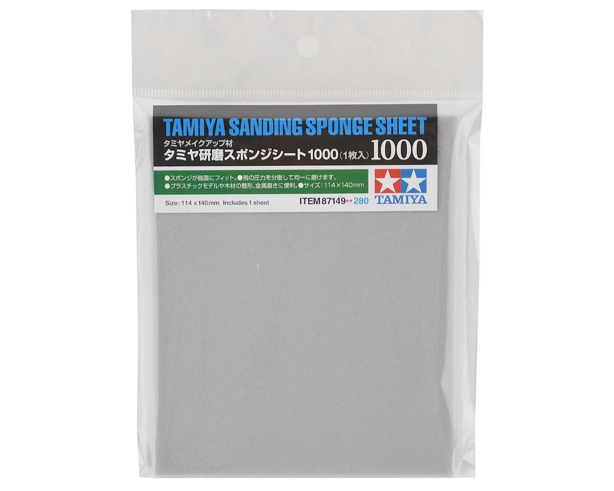 This is a Tamiya 1000 Grit Sanding Sponge Sheet, a flexible sponge base with an abrasive coat of sanding sheet that is well-suited for removing protrusions on plastic models and also finishing materials such as wood and metal. The sponge’s flexibility allows the finishing of curved surfaces and hard-to-reach corners. The sheet can be easily cut into the desired shape/size using a modeling knife. This product is suitable for wet sanding use.