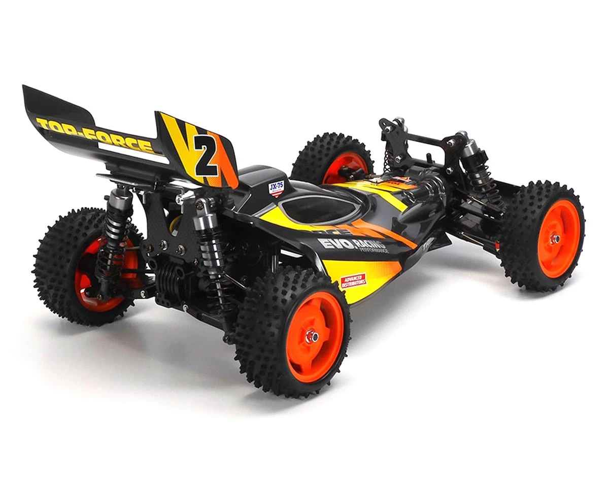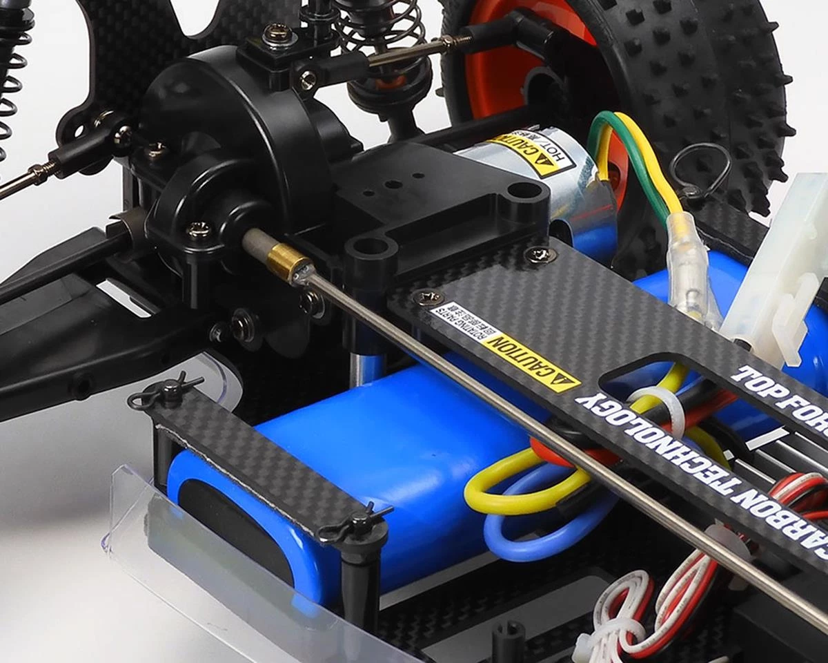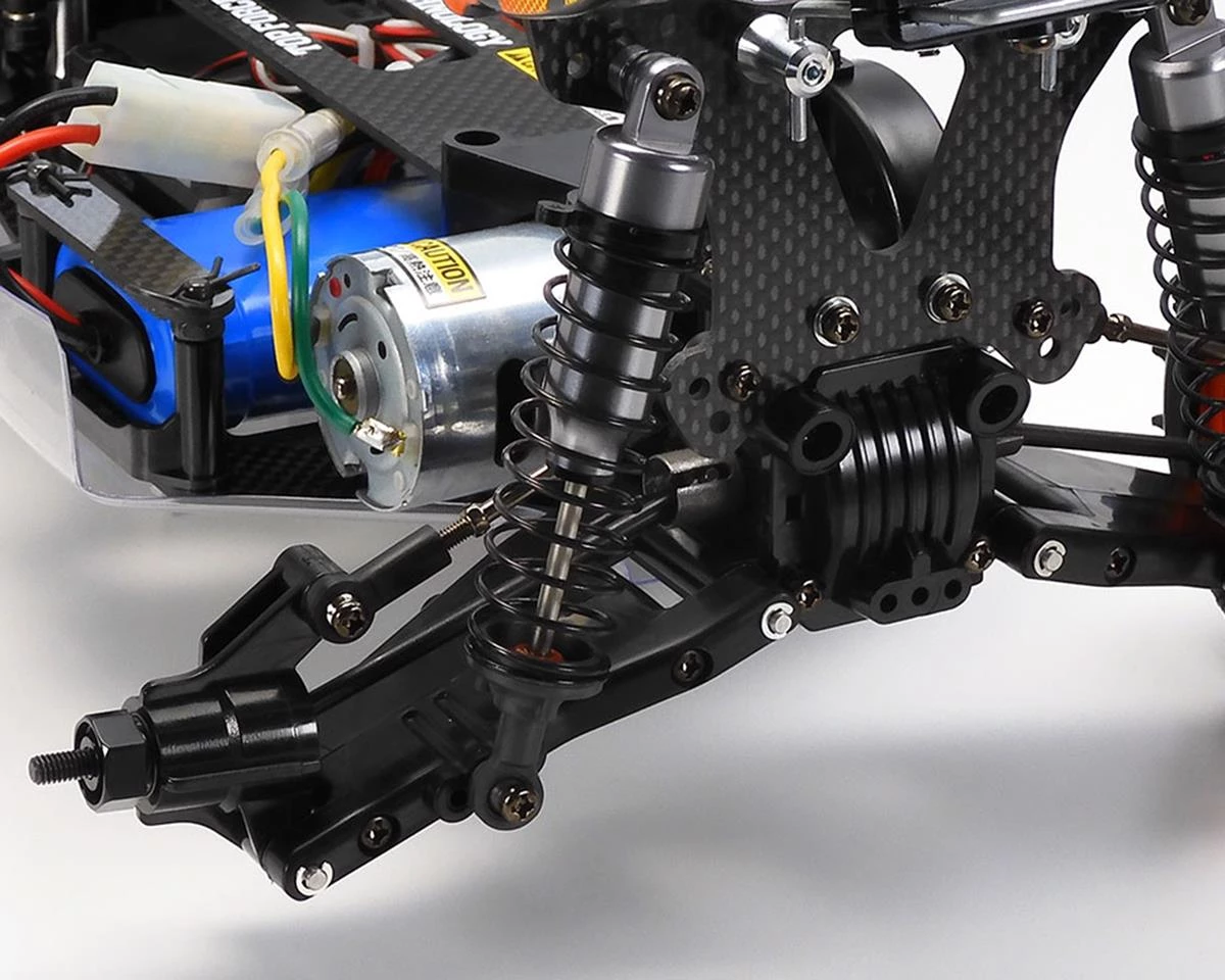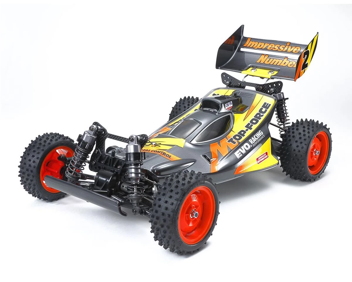 The Top-Force Evo. 2021 1/10 4WD Electric Buggy Kit is a limited edition re-release of the classic Tamiya Top-Force made in 1991. This 2021 model comes with updated part and electronics for a more modern age of RC enthusiasts. With features such as a low center of gravity carbon fiber chassis, pre-painted aerodynamic body, front and rear sealed gearboxes, double wishbone suspension and aluminum shock dampeners this buggy gives you a classic look with modern performance.