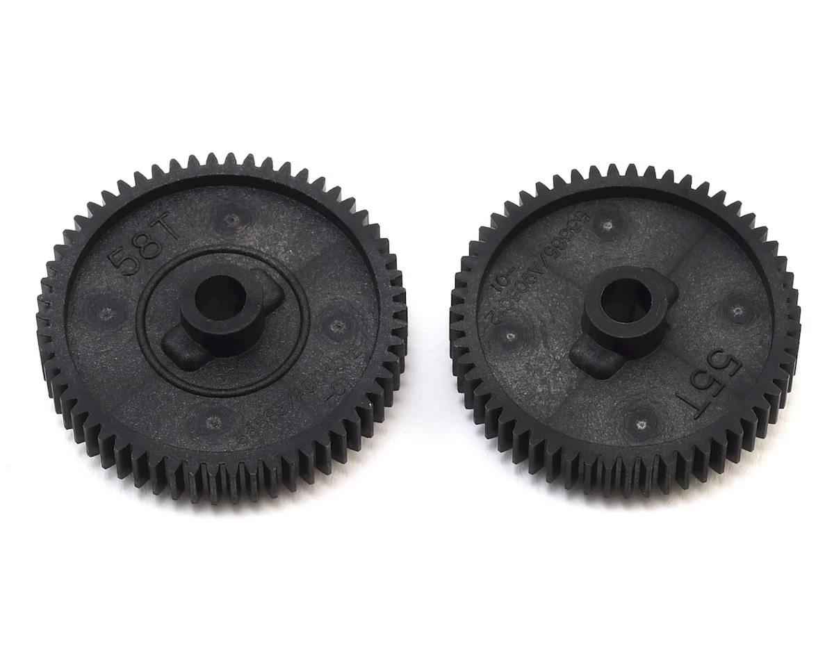 Tamiya TT-01 Spur Gear Set. Package includes one 55 tooth spur, and one 58 tooth spur.