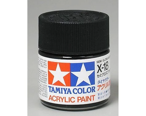 This is a Tamiya 23ml X-18 Black Semi-Gloss Acrylic Paint. Tamiya acrylic paints are made from water-soluble acrylic resins and are excellent for either brush painting or air-brushing. These paints can be used on styrene resins, Styrofoam, wood, plus all of the common model plastics. The paint covers well, flows smoothly and can be blended easily. Prior to curing, paint can be washed away with plain water.