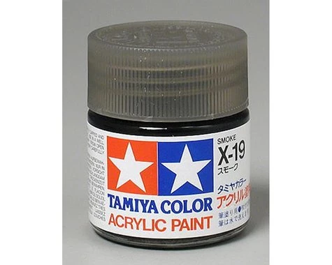 This is a Tamiya 23ml X-19 Smoke Gloss Finish Acrylic Paint. Tamiya acrylic paints are made from water-soluble acrylic resins and are excellent for either brush painting or air-brushing. These paints can be used on styrene resins, Styrofoam, wood, plus all of the common model plastics. The paint covers well, flows smoothly and can be blended easily. Prior to curing, paint can be washed away with plain water.