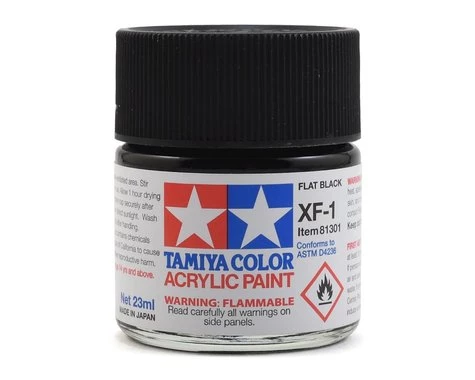 This Tamiya 23ml XF-1 Flat Black Acrylic Paint is made from water-soluble acrylic resins and is excellent for either brush painting or air-brushing. These paints can be used on styrene resins, Styrofoam, wood, plus all of the common model plastics. The paint covers well, flows smoothly and can be blended easily. Prior to curing, paint can be washed away with plain water.