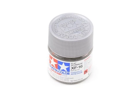 This Tamiya 10ml XF-16 Flat Aluminum Acrylic Paint is made from water-soluble acrylic resins and is excellent for either brush painting or air-brushing. These paints can be used on styrene resins, Styrofoam, wood, plus all of the common model plastics. The paint covers well, flows smoothly and can be blended easily. Prior to curing, paint can be washed away with plain water.