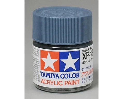 This Tamiya 23ml XF-18 Flat Medium Blue Acrylic Paint is made from water-soluble acrylic resins and is excellent for either brush painting or air-brushing. These paints can be used on styrene resins, Styrofoam, wood, plus all of the common model plastics. The paint covers well, flows smoothly and can be blended easily. Prior to curing, paint can be washed away with plain water.