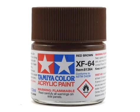 This Tamiya 23ml XF-64 Flat Red Brown Acrylic Paint is made from water-soluble acrylic resins and is excellent for either brush painting or air-brushing. These paints can be used on styrene resins, Styrofoam, wood, plus all of the common model plastics. The paint covers well, flows smoothly and can be blended easily. Prior to curing, paint can be washed away with plain water.